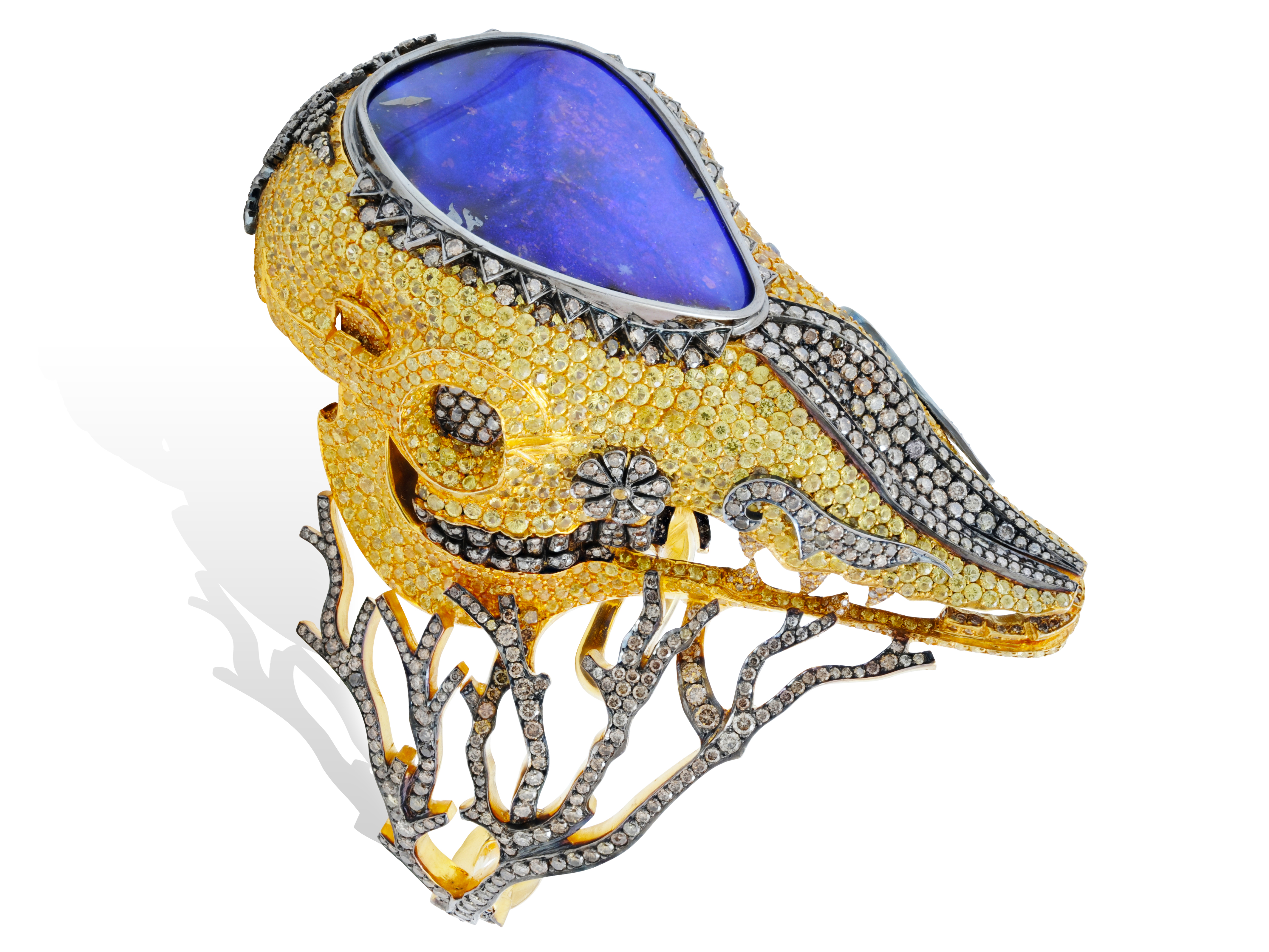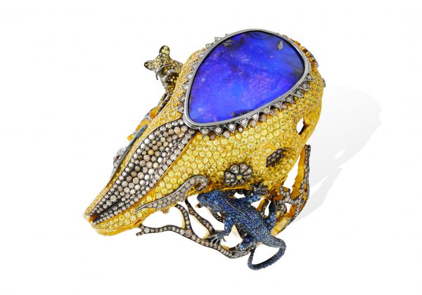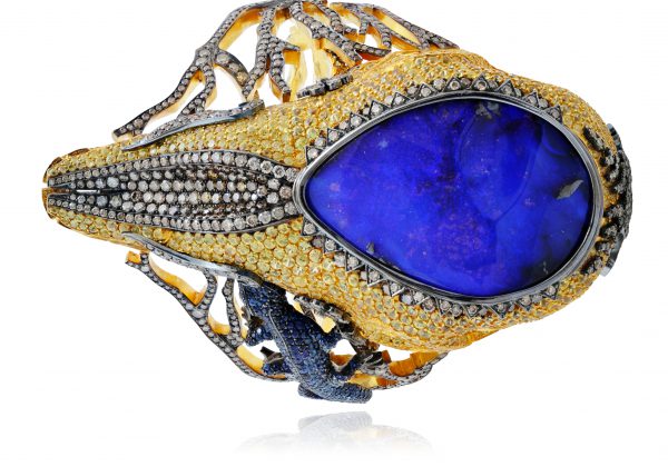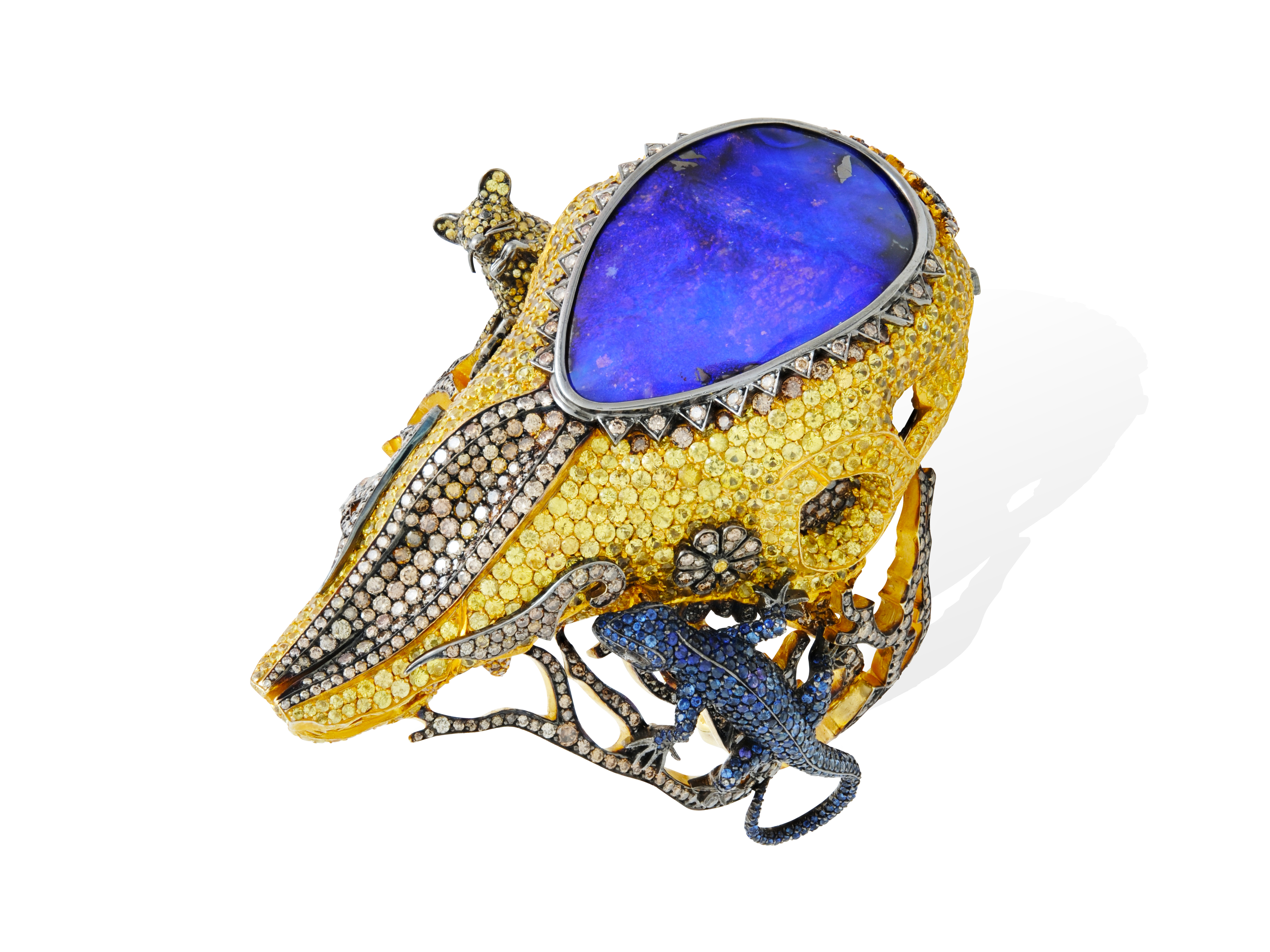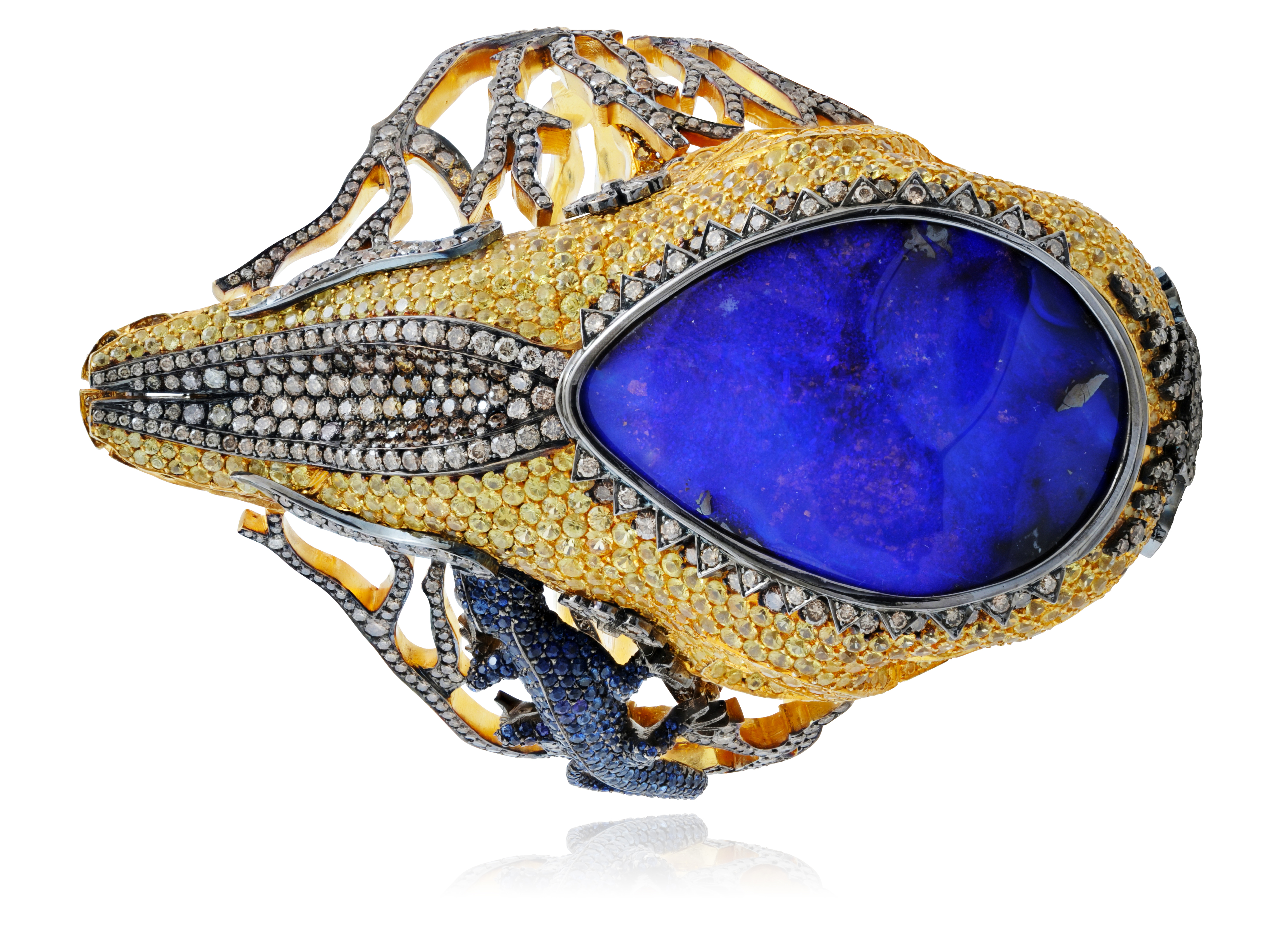 18kt gold, yellow sapphires, blue sapphire, diamonds, black diamonds, brown diamonds and Australian blue opal cuff