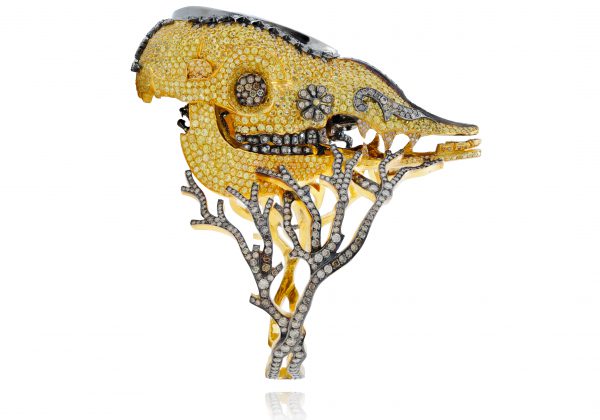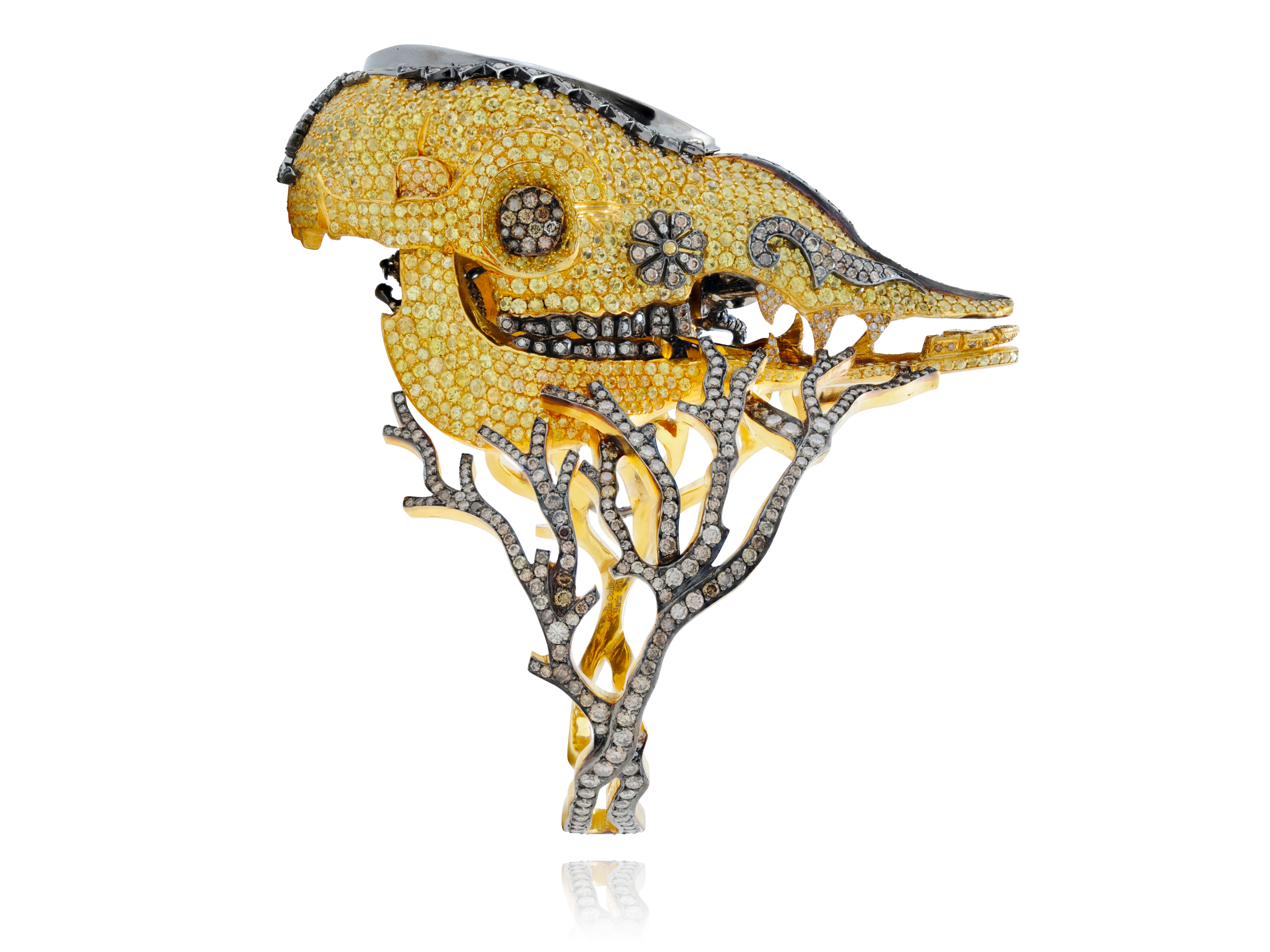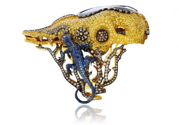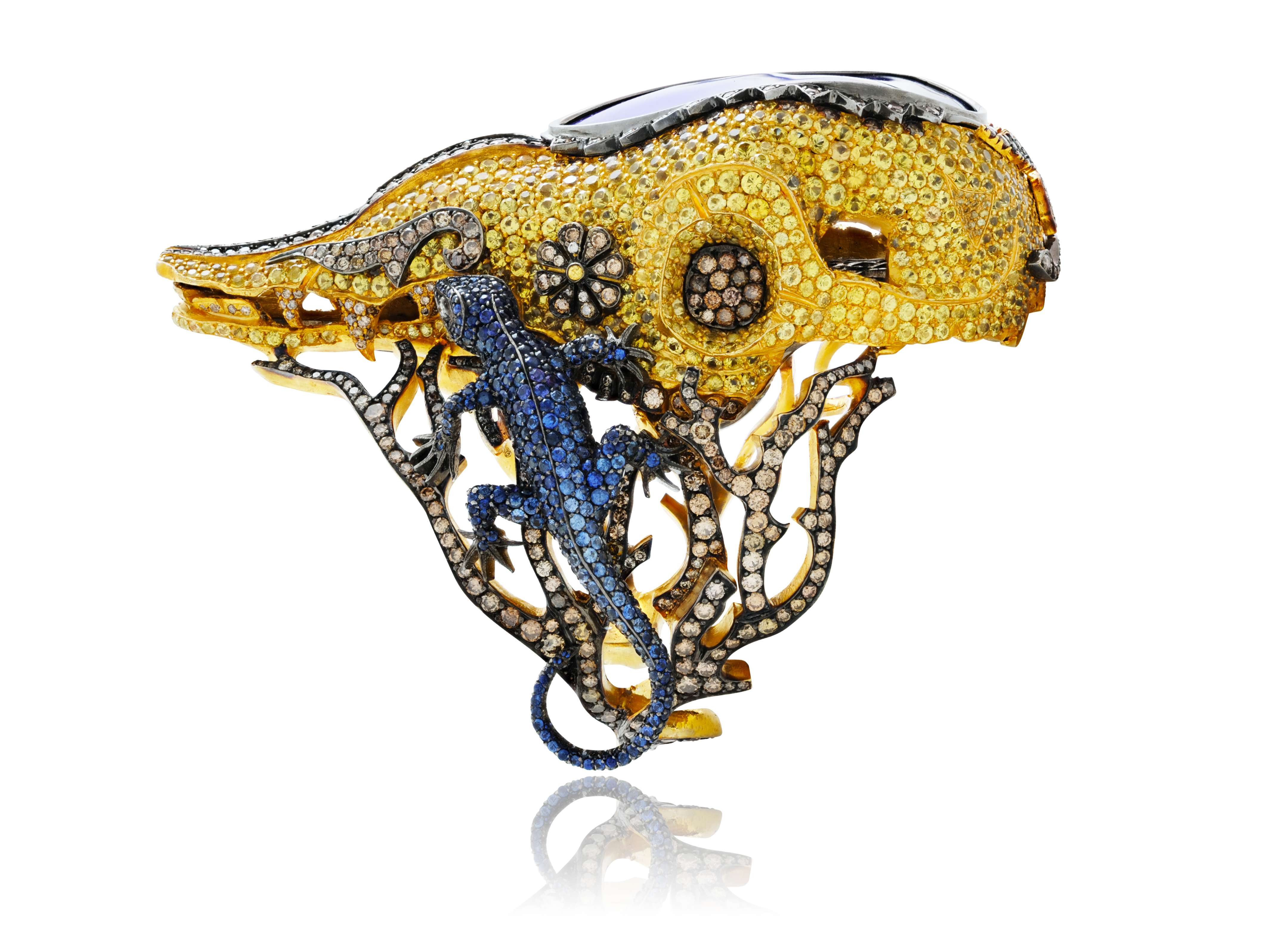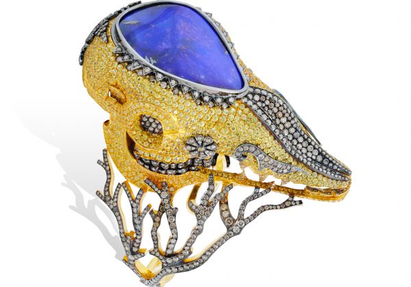 18kt gold, yellow sapphires, blue sapphire, diamonds, black diamonds, brown diamonds and Australian blue opal cuff
