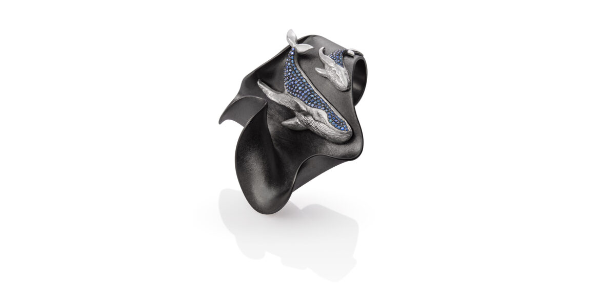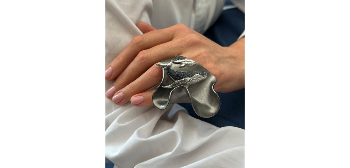 Elsa Sarantidou The Whale Ring Silver, light blue sapphires, black rhodium plated ring Unique and initialed Make it Yours ♥ The WHALE ring captures one of nature’s most sacred and awe-inspiring bonds, that of a mother whale and her calf navigating the vast, mysterious ocean. Sculpted in darkened metal that swells and curves like deep underwater currents, the piece evokes the silent grace of these giants moving through their liquid world. The whales themselves are rendered in soft silver, detailed with shimmering blue sapphires that ripple like starlight reflected in ocean waves. The larger figure curves protectively around the smaller, a gesture of love, instinct, and endurance. an ancient dance passed down through generation. But this story is not without sorrow. Whales, once the rulers of quiet seas, now face a rising tide of threats: warming waters, ship strikes, plastic pollution, entanglement in fishing nets, and the deafening noise of sonar that drowns out their haunting, beautiful songs. This ring becomes more than a tribute. it is a lullaby and a warning. It reminds us of the fragile heartbeat of the ocean, carried in the bodies of those who have sung its songs for centuries. To wear WHALE is to […]