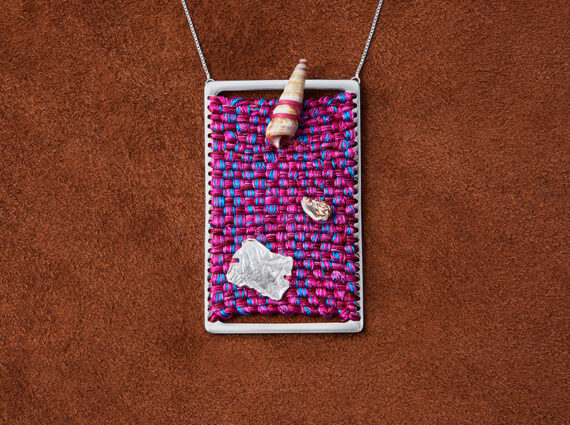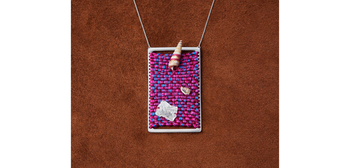 Translated into wearable form, these works become miniature constellations and landscapes: fibre held in tension around precious matter, colour acting as structure, thread enclosing light. Rather than adapting the work to jewellery, the artist allows each piece to emerge organically, preserving the gestures and layered compositions that define the language of art.