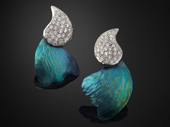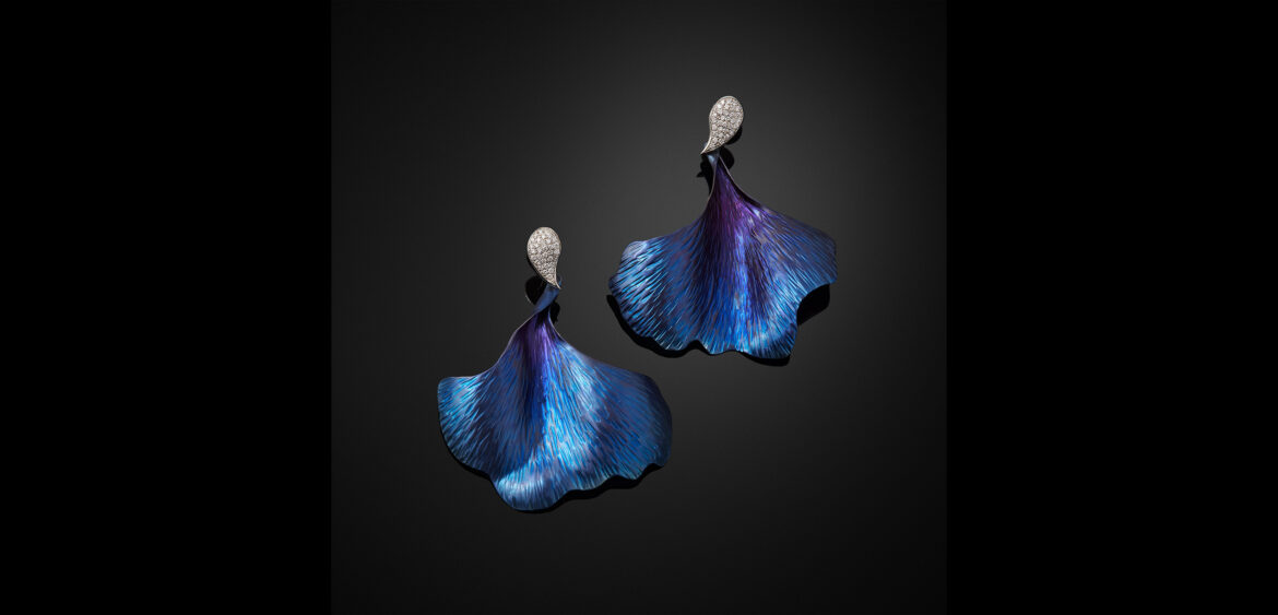 Known for their fragility, the delicate attributes of butterfly wings are juxtaposed in its materiality. Casted from delicate carvings into thin wax, the titanium wearable pieces of earrings and necklaces still play with our perception to materiality, as the incredibly lightweight jewellery pieces gleam in their chromatic spectrums. Feminine and beautiful, these reflections of elements of nature become an elegant statement piece to our everyday fashion.