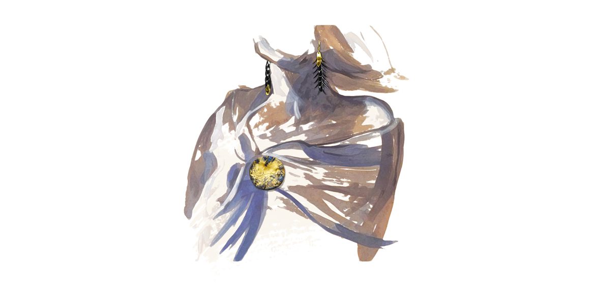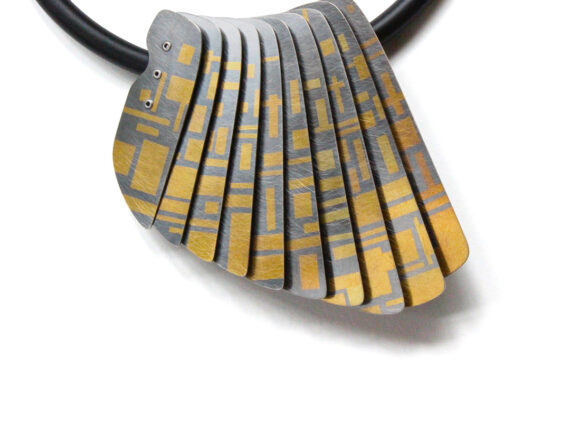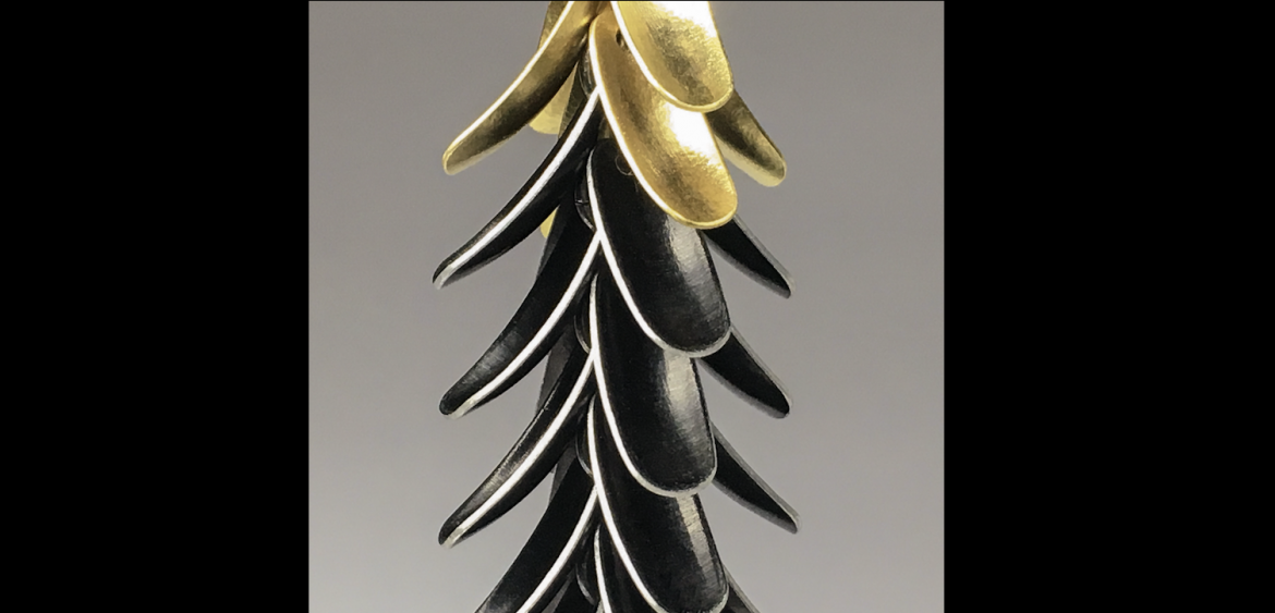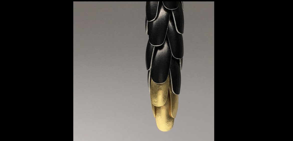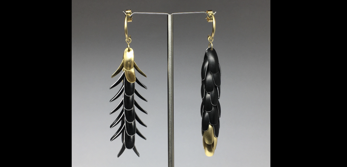 Elytra is the entomological name for beetle wings, which inspired this collection. Multiple elytra, made from dyed, anodised aluminium, are clustered together to form overlapping patterns that remind us of fish scales, flower petals and bird feathers. Earrings can be suspended upside down, causing the elytra to flare outwards, like an open pinecone.