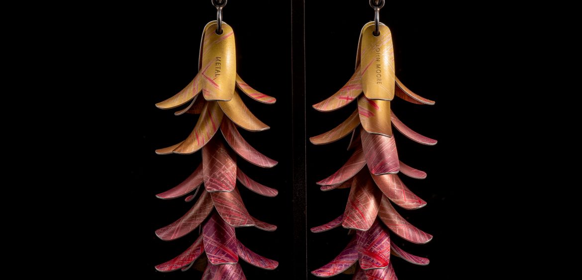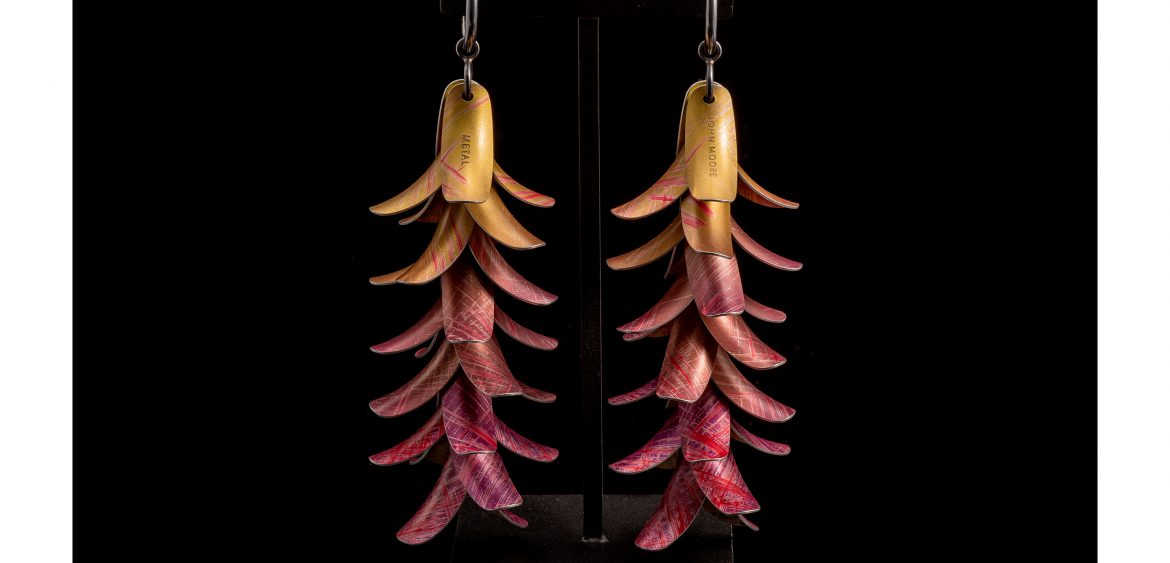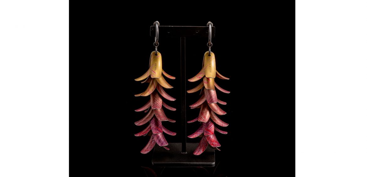 Elytra is the entomological name for beetle wings, which inspired this collection. Multiple elytra, made from dyed, anodised aluminium, are clustered together to form overlapping patterns that remind us of fish scales, flower petals and bird feathers. Earrings can be suspended upside down, causing the elytra to flare outwards, like an open pinecone.