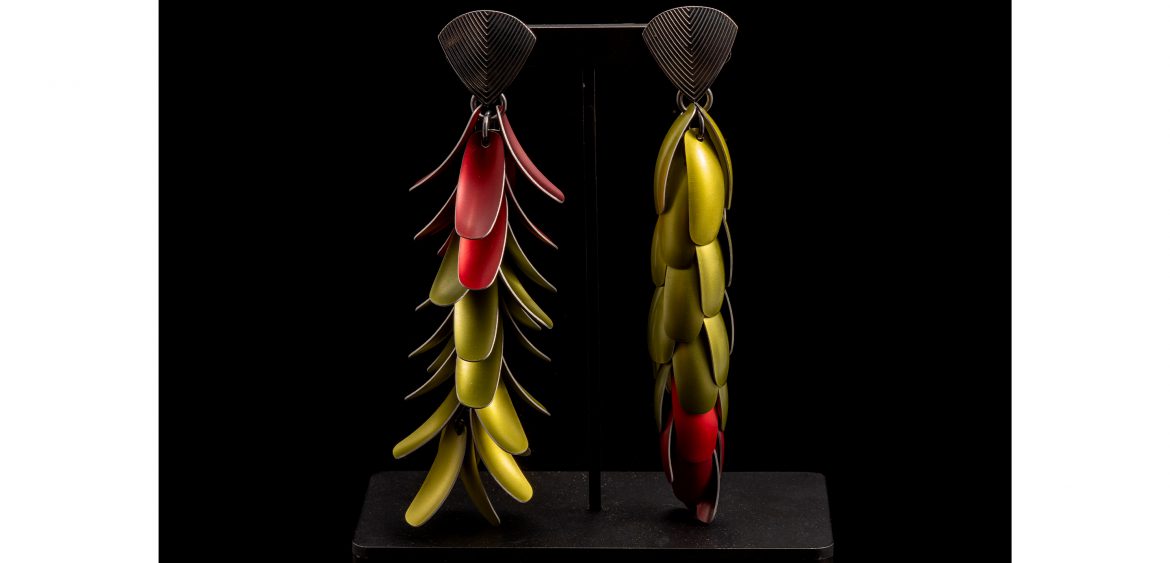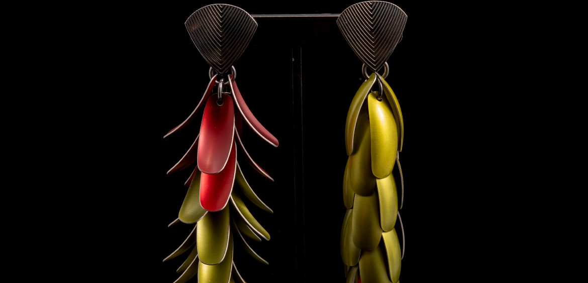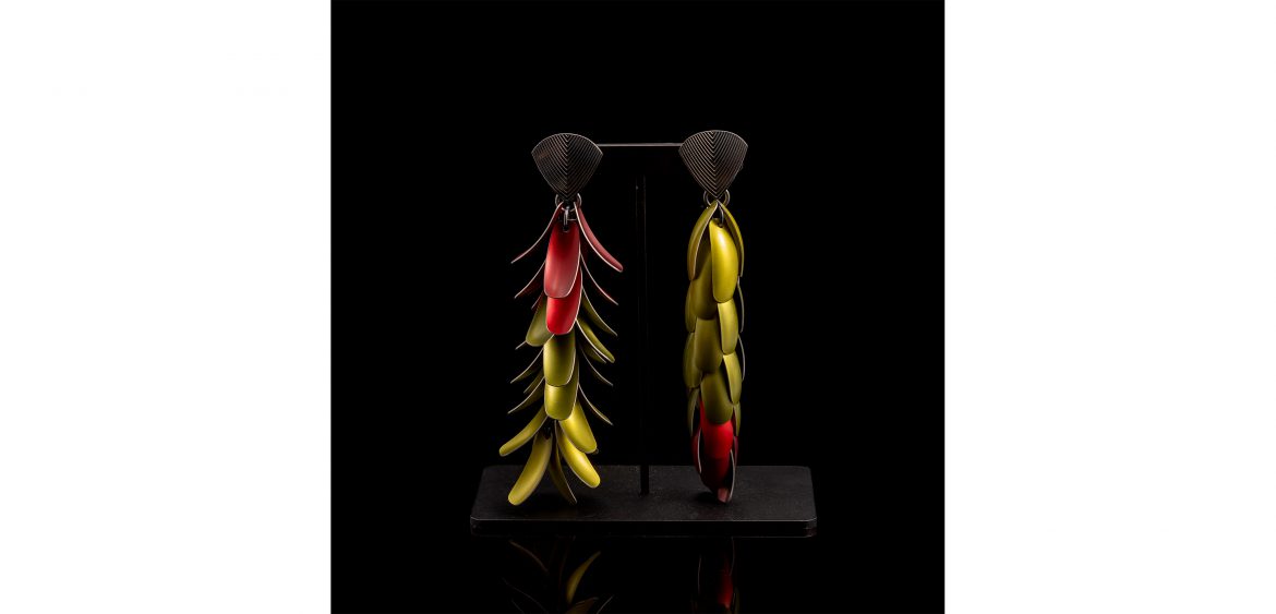 Elytra is the entomological name for beetle wings, which inspired this collection. Multiple elytra, made from dyed, anodised aluminium, are clustered together to form overlapping patterns that remind us of fish scales, flower petals and bird feathers. Earrings can be suspended upside down, causing the elytra to flare outwards, like an open pinecone.