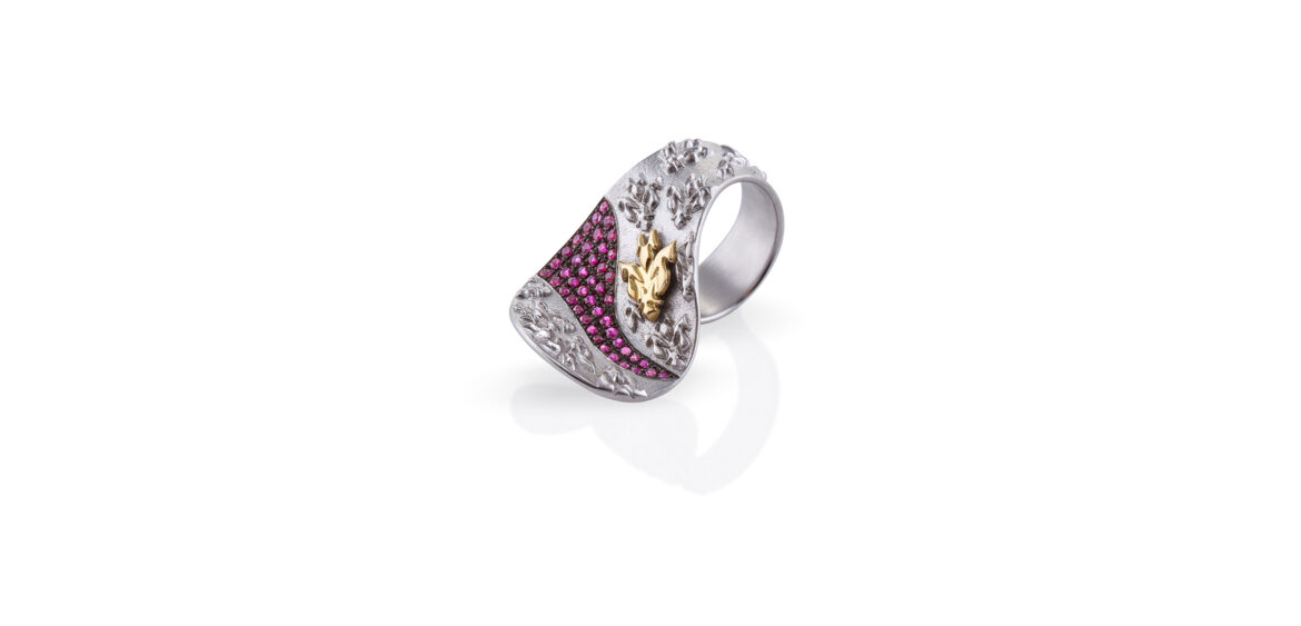 Its flowing silhouette echoes the soft undulations of garden paths after rainfall, where nature slowly reclaims its curves. A lush ribbon of pink sapphires winds through the silver landscape, framed by delicately carved foliage. At the heart of this scene, a golden blossom unfolds — the garden’s centre, pulsing with warmth and hidden fire.