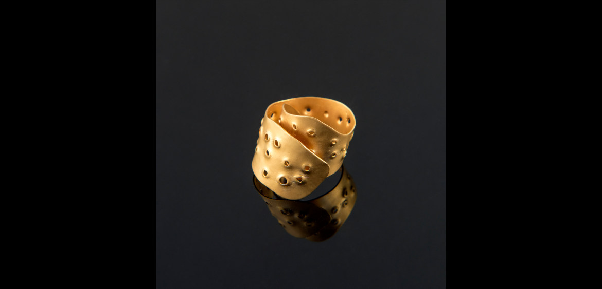 ‘I had never designed wearable art before, nor had the idea of doing it ever crossed my mind. But when a friend asked if I’d be interested, I immediately said yes. My points of reference were very personal: I wanted to design something that I could see myself wearing, and something that would have a continuity with my work as an artist. That meant that there would have to be holes; recently, I have been particularly fascinated by the texture created through drilling. And there would have to be folds or curves, because they are elegant and mysterious: what’s on the other side? These two considerations led me to think of the bracelet and ring: flat surfaces that would become textured through drilling and voluminous through folding. Surprisingly, pretty much the first sketches I made felt right, and I resisted every impulse to tinker with them.’ – Sophie Whettnall