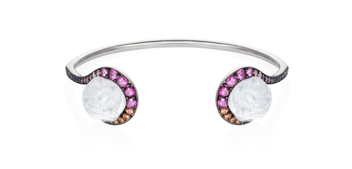 18kt white gold, carved rock crystal, pave sapphire, amethyst and diamonds cuff
