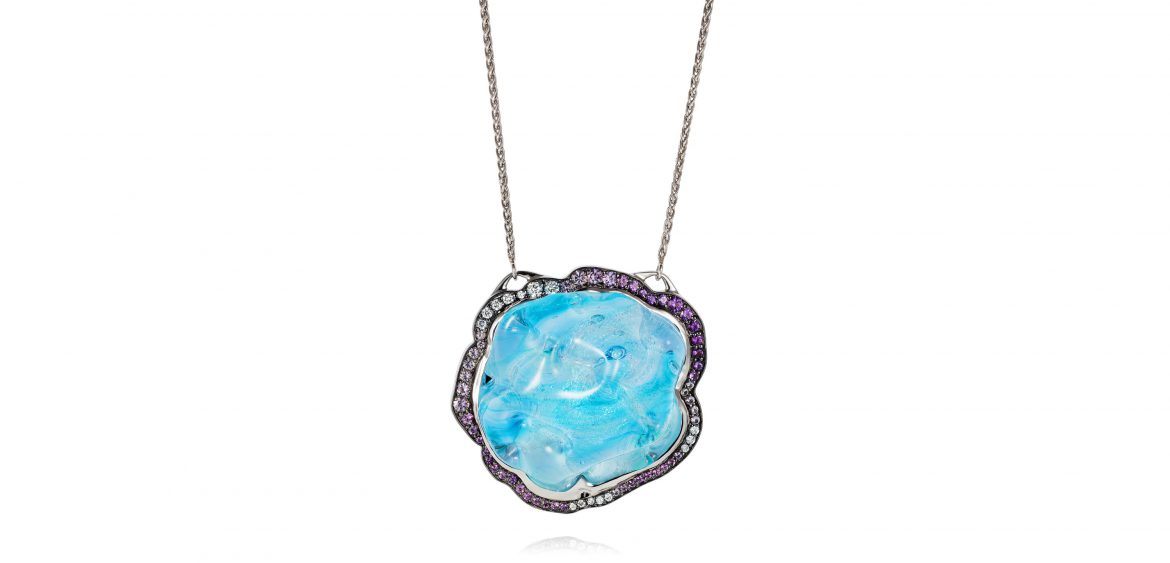 18kt white gold, dichroic glass, pave amethyst, diamonds