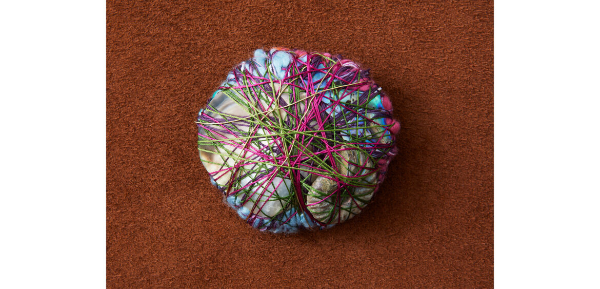 Cosmic Jewellery draws inspiration from two central forms in Hicks’ practice: the sculptural Boules and the intimate Minimes. The Boules, spheres composed of threads wrapped around a core often formed from garments once belonging to friends or family, are affectionately described by the artist as her “memory bundles.