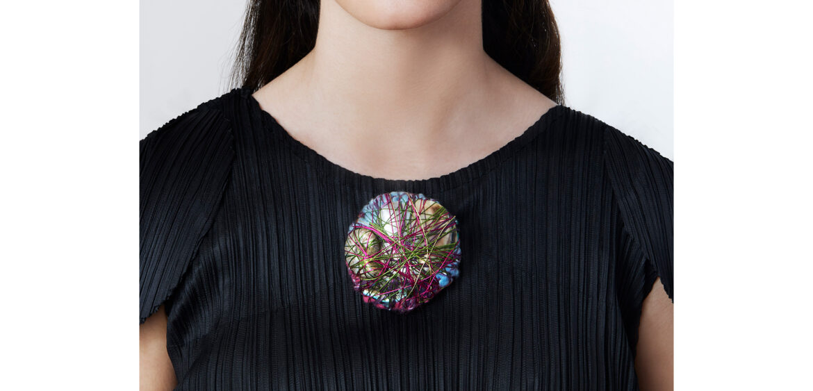 Translated into wearable form, these works become miniature constellations and landscapes: fibre held in tension around precious matter, colour acting as structure, thread enclosing light. Rather than adapting the work to jewellery, the artist allows each piece to emerge organically, preserving the gestures and layered compositions that define the language of art.